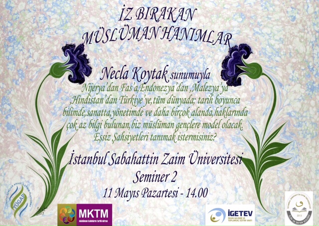 - - 15 Mayıs 2015 11 Mayıs 2015 Pazartesi, İstanbul Sabahattin Zaim Üniversitesitesi öğrencilerine İnsan Gelişimi ve Toplumsal Eğitim Vakfı (İGETEV) Genel Sekreteri Necla KOYTAK tarafından “İZ BIRAKAN MÜSLÜMAN KADINLAR” semineri verildi. CategoryHaber / Duyuru Share Tweet +1 Pin it